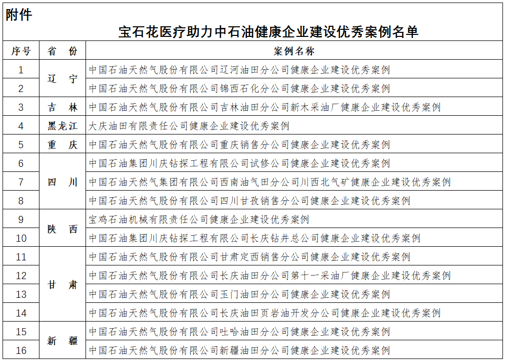 4月23日,国家卫生健康委办公厅正式发布第四批健康企业建设优秀案例名单。其中,中国石油天然气集团有限公司(以下简称“中石油”)16家入选企业由通用技术宝石花医疗提供全程技术支持,包括辽河油田、新疆油田、西南油气田、大庆油田、锦西石化等多家重点单位。这一成果标志着宝石花医疗在央企健康服务领域的创新实践持续获得国家级权威认可。